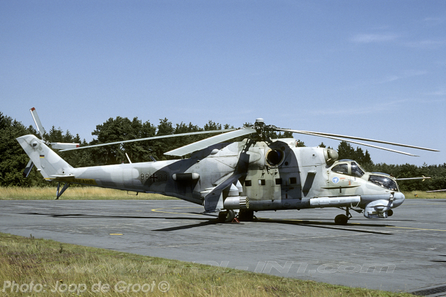 This helicopter Mil Mi-24P Hind F was delivered (apparently) with temporary Soviet markings from a Soviet AB in East Germany to Basepohl on November 30, 1989. Registered there in East Germany by the Nationale Volksarmee and operated by KHG-5 out of Basepohl till October 3, 1990.